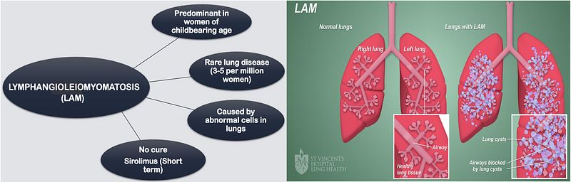 Lymphangioleiomyomatosis (or “LAM disease”) is a rare lung disease that primarily affects women of childbearing age (average age=35). The exact number of women with LAM is unknown but it is estimated that for every 1 million women in the world, 3-5 women will have LAM. This life-threatening disease is caused by slow accumulation of abnormal cells in the lungs. Normally, when we breathe in air, it flows through our breathing airways to the lungs, so that the lungs take up oxygen in the air to maintain body functions. However, in LAM disease, the abnormal cells block the breathing airways and damage the lungs, leading to difficulty in breathing. The most common symptoms of LAM include shortness of breath, chronic cough, unexplained tiredness, difficulty in breathing and chest pain. There is currently no cure for LAM. However, an FDA approved drug known as “Sirolimus” has proven to improve lung function in some patients.